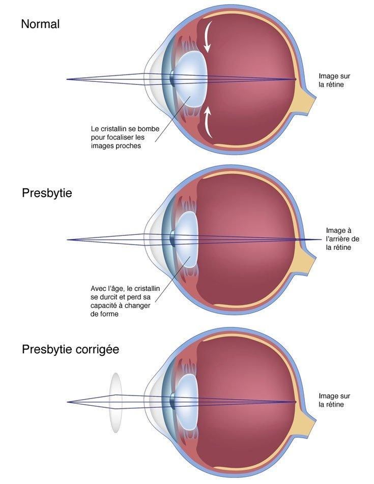 Elle se traduit par une difficulté à voir de près. Elle résulte d’une perte de souplesse du cristallin qui se bombe insuffisamment et accommode difficilement : comme l’autofocus d’un appareil photo qui n’assurerait plus la mise au point.